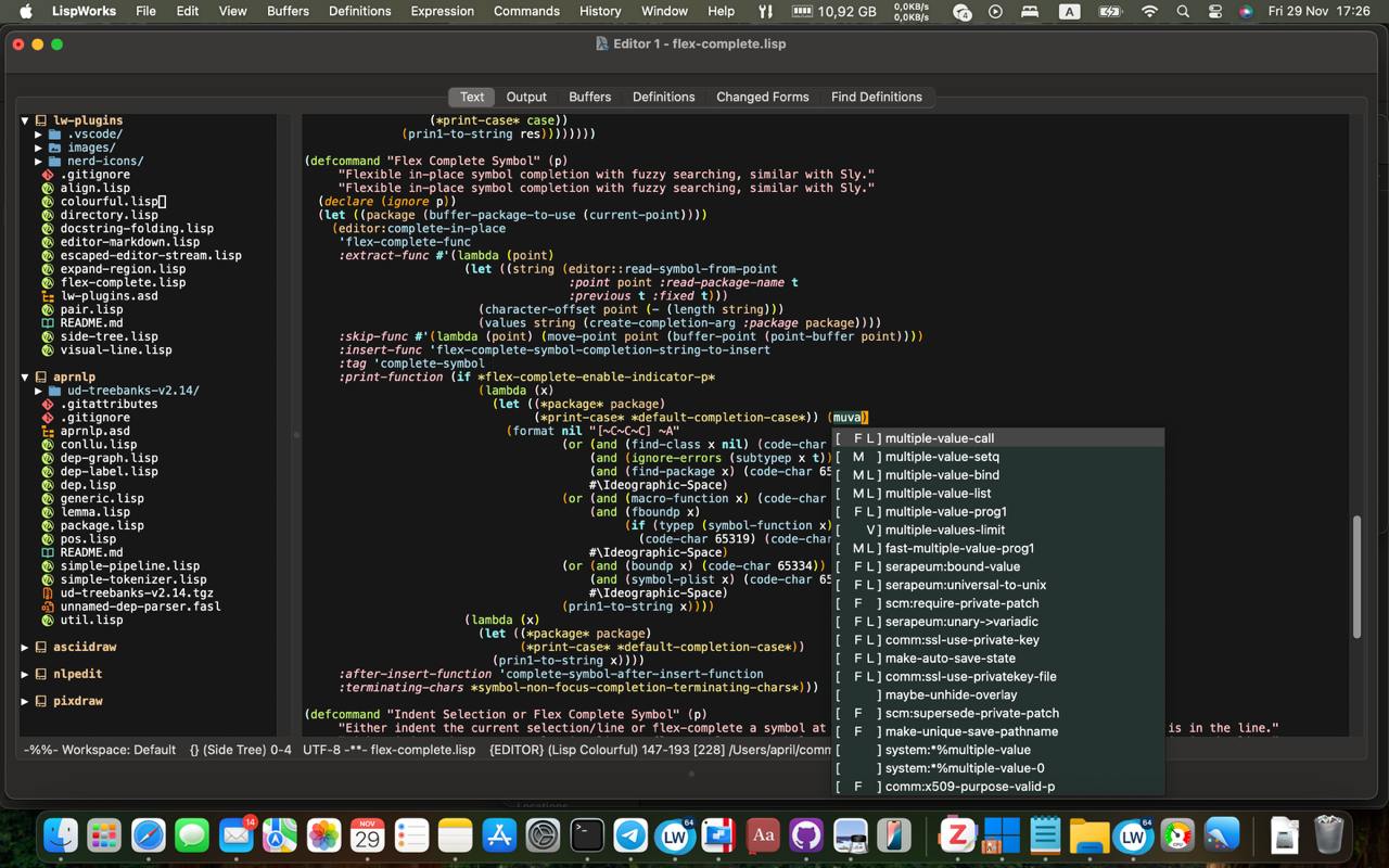 Недавно на Reddit анонсировали библиотеку расширений для LispWorks - lw-plugins. Она добавляет сайдбар с деревом папок, кастомные иконки, фолдинг докстрингов и многое другое. На скриншоте к моему посту демо некоторых фич.